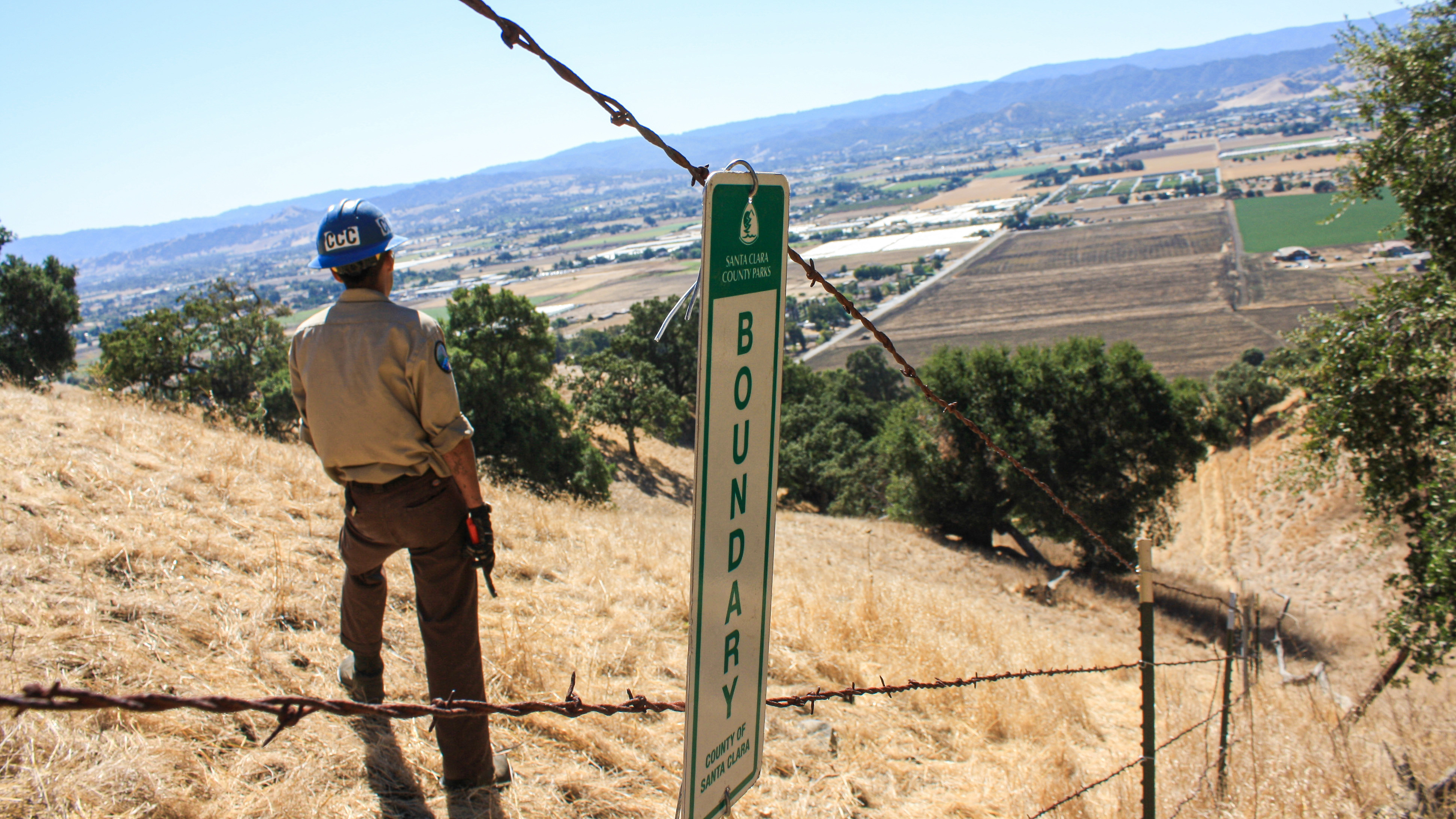 Corpsmember Julian Burgos looks out over Morgan Hill after he and his crew completed renovations of cattle fencing at Coyote Canyon Park.