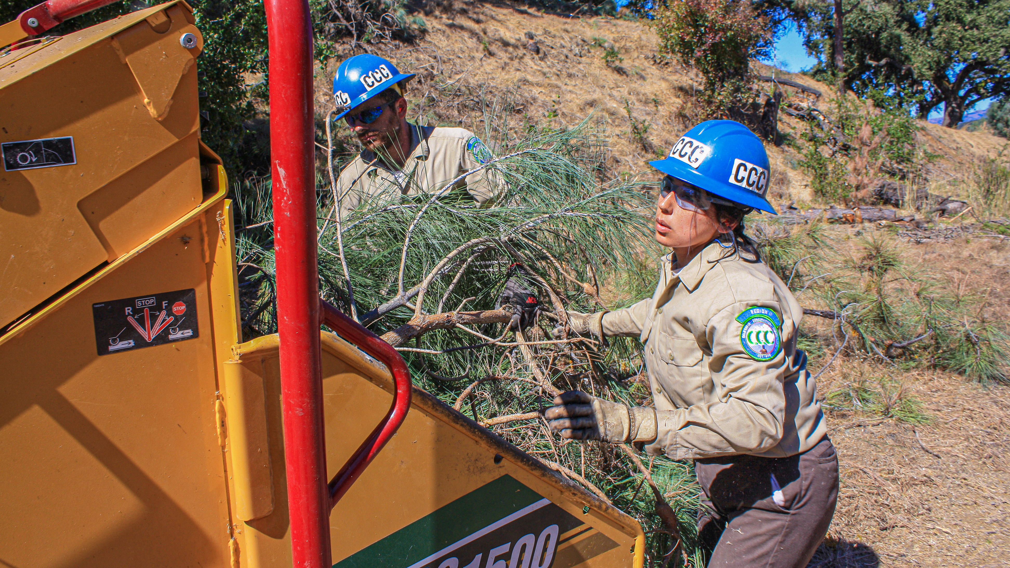Corpsmembers Shane Boswell and Kimberly Reyes-Maravillo pull tree limbs into wood chipper as they treated 6.5 acres during a week of work near Morgan Hill.